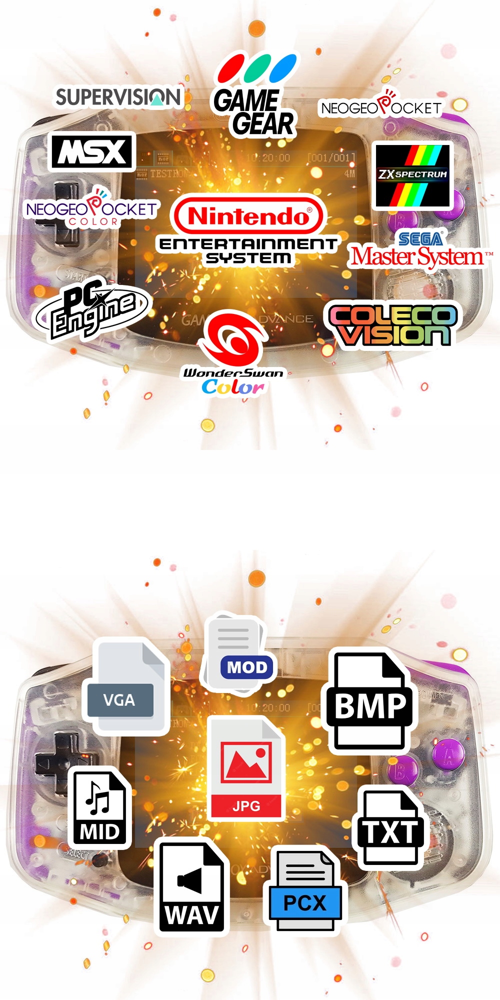 По-перше, він дозволяє відтворювати широкий спектр графічних, текстових і музичних файлів. Крім того, він відновлює резервні копії у вигляді файлів ПЗУ зі старих консолей і комп’ютерів. Іншими словами, на екрані GBA можна емулювати величезну кількість платформ!