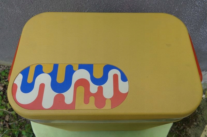 Цікавий, цікавий туристичний холодильник Ezetta 1970-х років. Холодильник виготовлений в Італії. Холодильник не використовувався. Експонат має морозильні вставки з охолоджувальною рідиною та шнурок для їх кріплення. Кришка холодильника закривається магнітами, які працюють. Зверху з боків розташовані ручки для відкриття кришки холодильника. Холодильник помаранчевий. На фото видно позначки та підписи. Рекомендую всім.