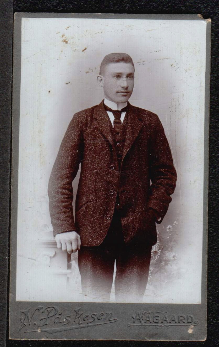F0245; Чоловік позує. Оригінальна фотографія на картоні приблизно 1900 р. Ательє Н. Паскесена. Аагаард. Розмір: прибл. .6,5 х 10,5 см. Стан як на фото