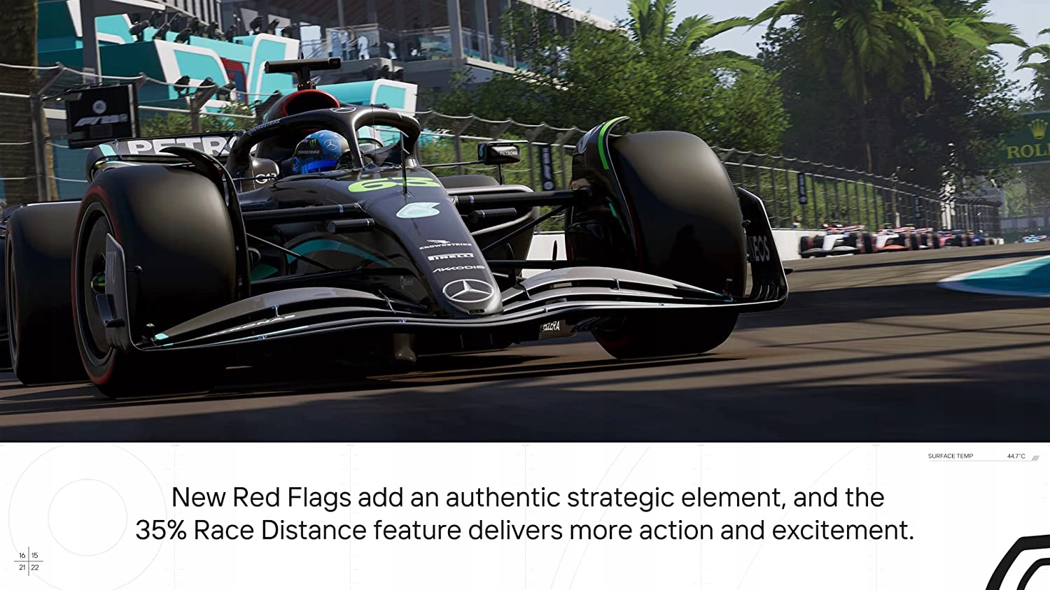 Закрутіть педаль у EA SPORTS™ F1® 23, офіційній відеогрі FIA Formula One World Championship™ 2023 . Нова глава захоплюючого сюжетного режиму «Шлях до слави» з драматичною історією та жорсткою конкуренцією. Змагайтеся на нових трасах у Лас-Вегасі та Катарі та отримуйте нагороди та модифікації у F1® World. Червоні прапорці — це новий автентичний стратегічний елемент, а перегони на 35% дистанцій забезпечують більше дії та азарту. Насолоджуйтесь оновленими автомобілями 2023 року з офіційною лінійкою F1®, яка включає 20 ваших улюблених пілотів і 10 команд. Створюйте команду своєї мрії в режимі кар’єри «Моя команда», змагайтеся в режимі розділеного екрану або розширеній міжплатформній грі та приєднуйтесь до спільноти за допомогою нових ліг Racenet.