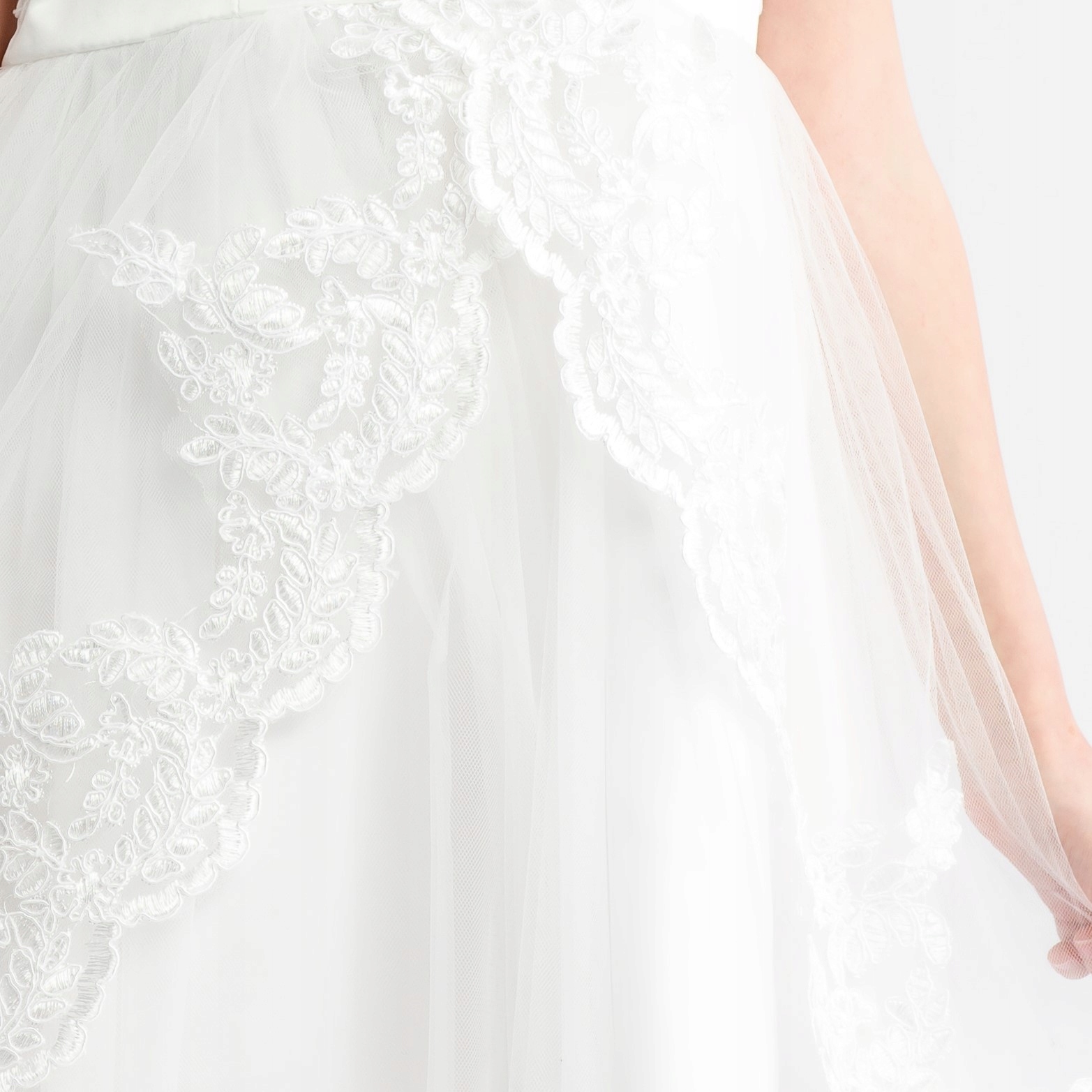 Його вишиті деталі надають йому непереборного шарму. Асиметричний низ із трьома шарами тюлю додає сукні елегантності та робить її вигляд ще більш особливим. Вишивка додає унікальний характер.