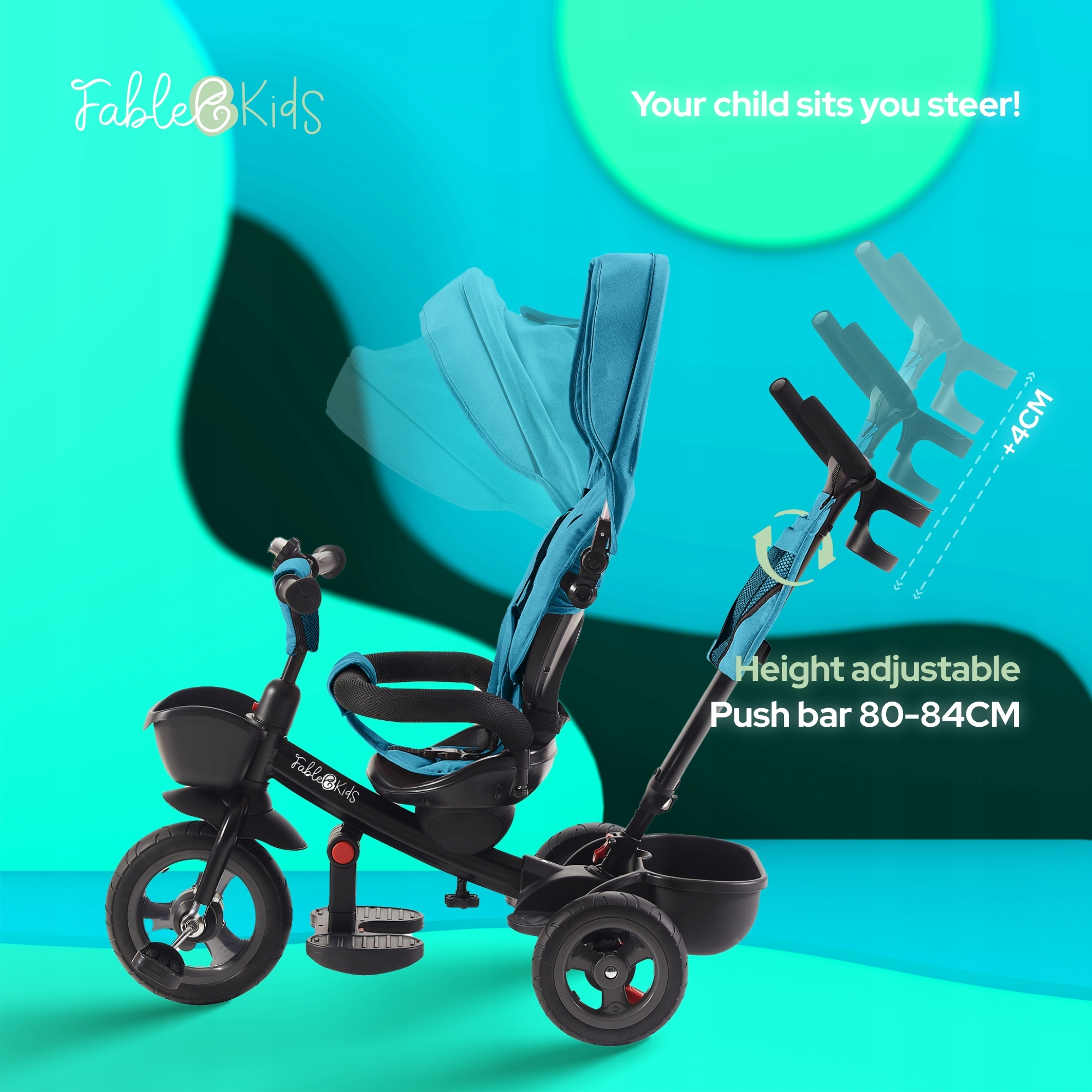 Сидіння можна повернути на 360 °, тому, якщо потрібно, ви можете повернути дитину у напрямку, наприклад. щоб заспокоїти їх. Дитяче сидіння з 3-бальною ременем безпеки м'яко підкладене і покрите 600D Оксфорд! Крім того, кермо має ручки, що не мають ковзання.