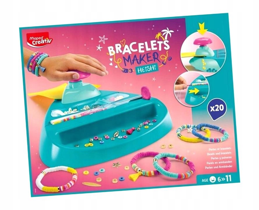 Фабрика браслетів - чудова ідея для веселого відпочинку. Успіх гарантовано. Машина гарантує, що нам ніколи не вистачить бісеру для створення красивих прикрас. У наборі 8 різнокольорових аркушів з EVA (матеріалу, який безпечний, легкий, легко ріжеться і водночас приємний на дотик). Загалом з них можна виготовити до 1700 плоских круглих намистин хейші. Такі намистини придумали індіанці Північної Америки, які робили їх з черепашок, бірюзових або срібних трубочок. Машинка полегшує нанизування виготовлених намистинок на нитку. У набір входять китиці, золоті намистини, роздільники та декоративні брелоки.