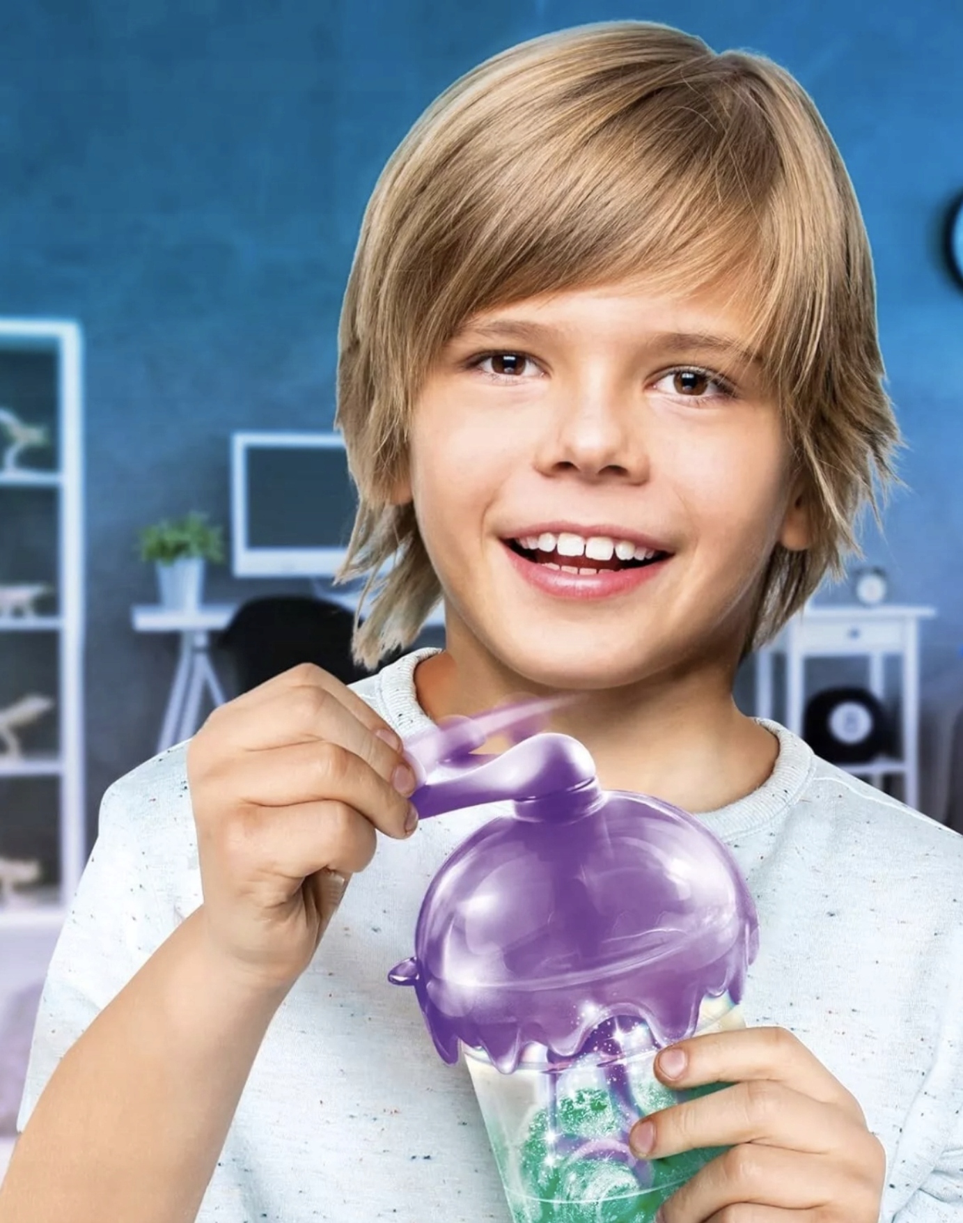 Насипте порошок і вибрані добавки, напр. блискітки та налийте воду в шейкер/міксер, потім енергійно струсіть або перемішайте. Для більш цікавого ефекту в отриману масу можна додати фігуркиз набору.