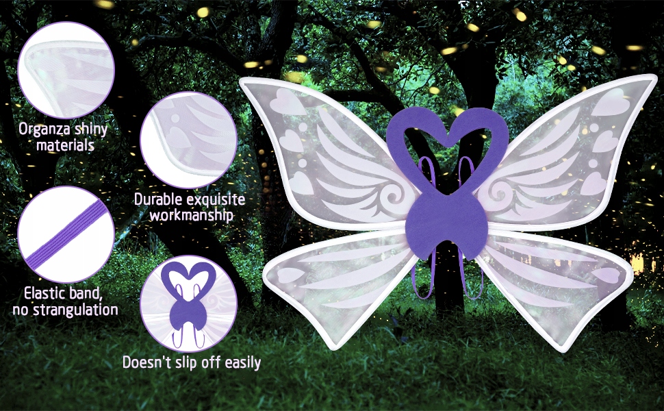 Крильця феї мають розміри 59 см (Д) x 41 см (В) і оснащені еластичними стрічками для легкого одягання та знімні, що робить їх придатними для більшості дітей і жінок.