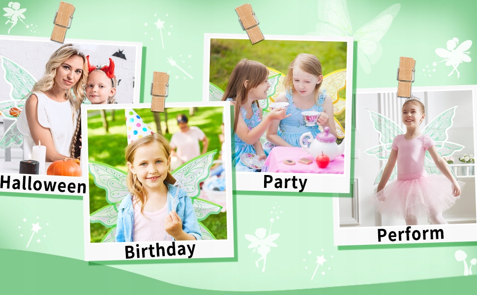 - Безліч випадків: крила феї на будь-який випадок, Хеллоуїн, аксесуари для весільних квітничок, аксесуари для фотозйомки, костюмовані вечірки, сценічні виступи, дні народження.