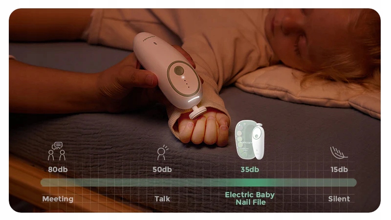 Електричний файл нігтів для дітей Momcosa - це практичне і мирне рішення. Інтегрована з найсучаснішою системою світлодіодного освітлення на 360 °, вона висвітлює кожен кут пальців вашого малюка, усуваючи тіні та зменшуючи ризик надмірного пиляння або пошкодження. Працюючи на рівні шуму лише 35 дБ у найсміливішому режимі, цей електричний файл нігтів поважає спокій дитячого середовища сну, що дозволяє задовольнити його потреби в галузі догляду за нігтями, не викликаючи тривоги і не розбиваючи його. p>
