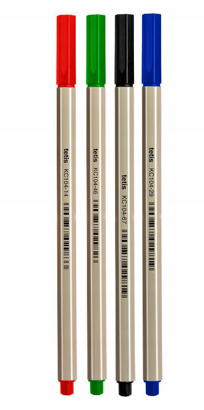 Характеристики продукту: - гексагональні тонкі підводки, - нетоксичні чорнило, - оснащено вентильованим ковпачком, - стійкий до розриву наконечник, - волокнистий наконечник забезпечує точну лінію письма, - продукт упакований у блістер. Увага! Продукт не призначений для дітей. Розмір упаковки: 4,5x22,5x1 см Колір: чорний, синій, зелений і червоний Товщина наконечника: 0,7 мм Товщина лінії письма 0,4 - 0,5 мм