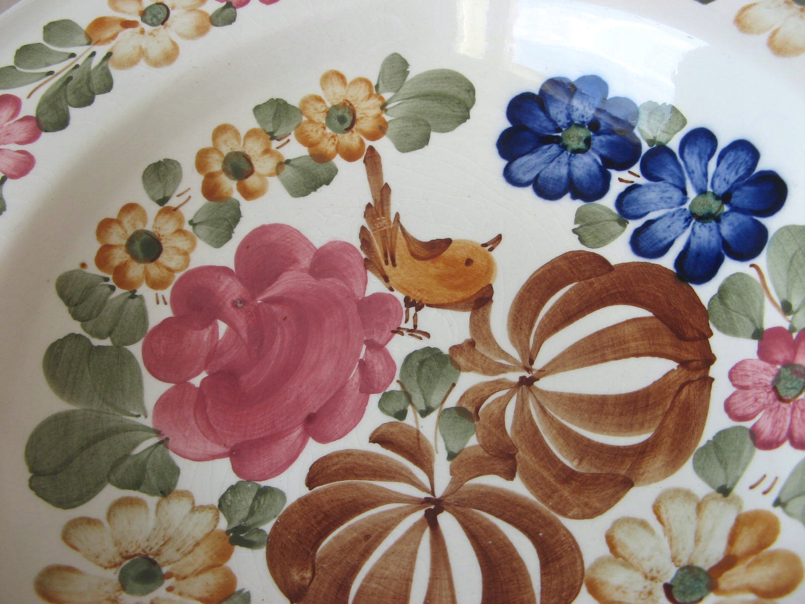Fajans WŁOCŁAWEK duża PATERA do ZAWIESZENIA z Kolorowym PTAKIEM z PTASZKIEM