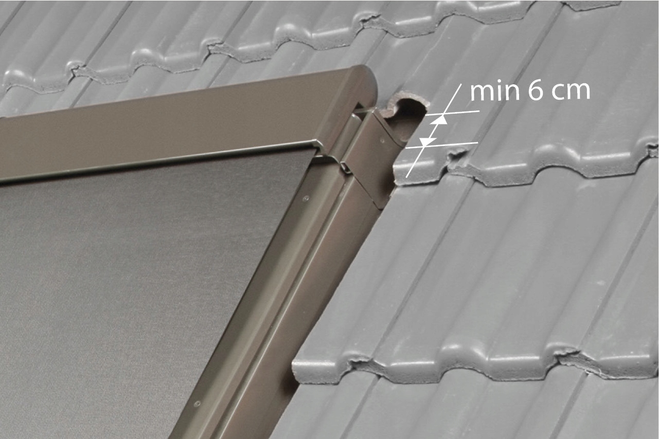 У разі меншої відстані необхідно підрізати черепицю / металочерепицю (що не завжди можливо). У цьому випадку ми рекомендуємо використовувати стандартний тент АМЗ з касетою, встановленою на верхній частині фланця.