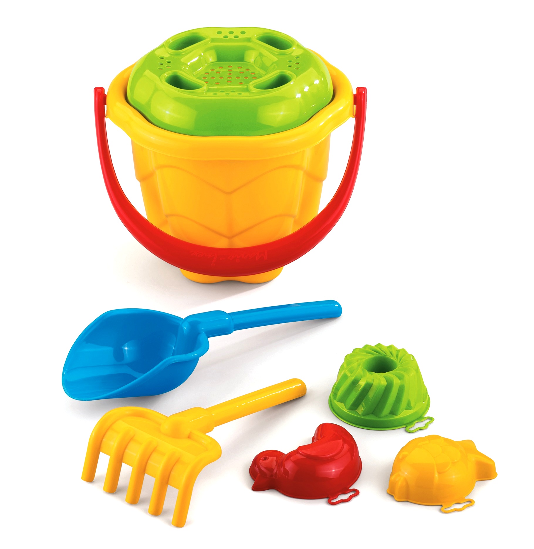 В набір входить: відро з ситечком, лопата, граблі, 3 форми