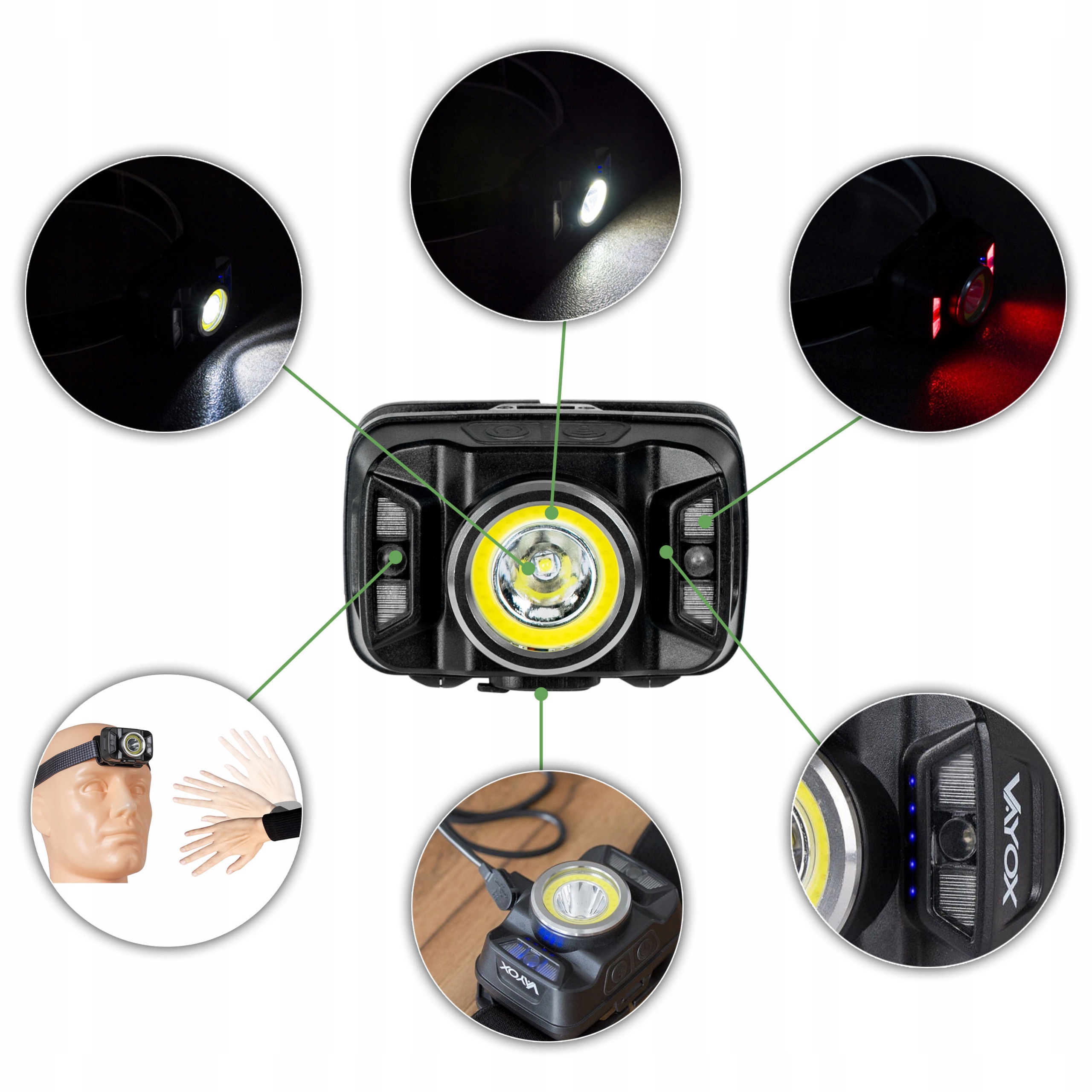 - Акумулятор 3,7 В, кабель USB, ліхтарик VA0025, наголов'я b>, оригінальнаупаковка