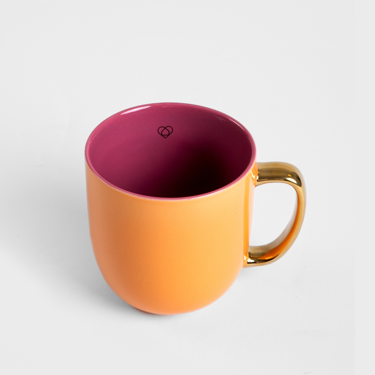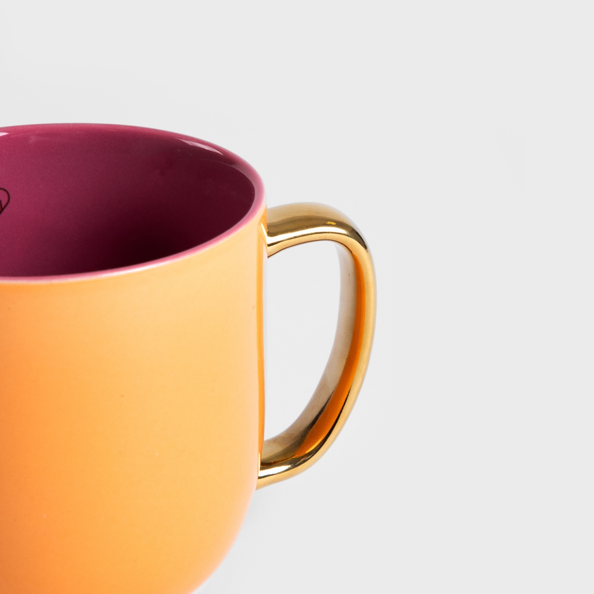 Елегантний порцеляновий кухоль утримується в помаранчевому відтінку, а внутрішня частина чашки має рожевий колір. У кружці є прекрасна золота ручка. Завдяки суцільному та делікатному порцеляну, чашка приємна на дотик і ідеально підходить для подачі щоденних напоїв.