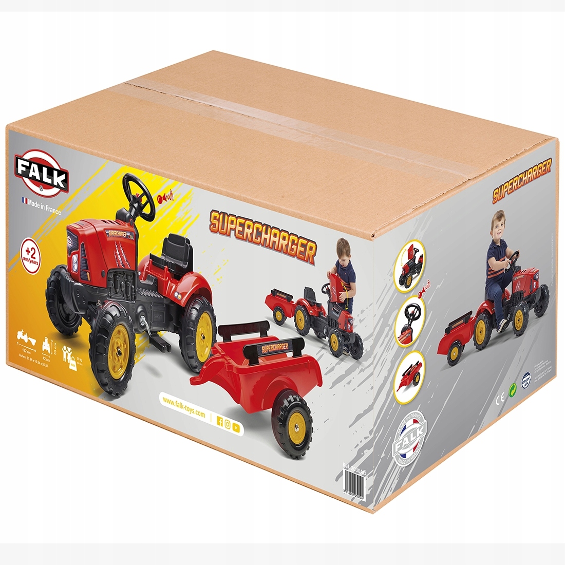 Педальний трактор Red Supercharger із причепом виробництва FALK — це мрія багатьох водіїв маленьких тракторів. Зроблено акуратно, з увагою до найменших деталей! ЖоденФермер не зневажав би таке. Автомобіль виготовлений з матеріалів найвищої якості, призначений для дітей від 2 років. Автомобіль оснащений знімним причепом з панелями та рульовим колесом з звуковим сигналом. Колеса трактора виготовлені з високоякісного пластику. Трактор також має відкривається капот з імітацією справжнього двигуна.