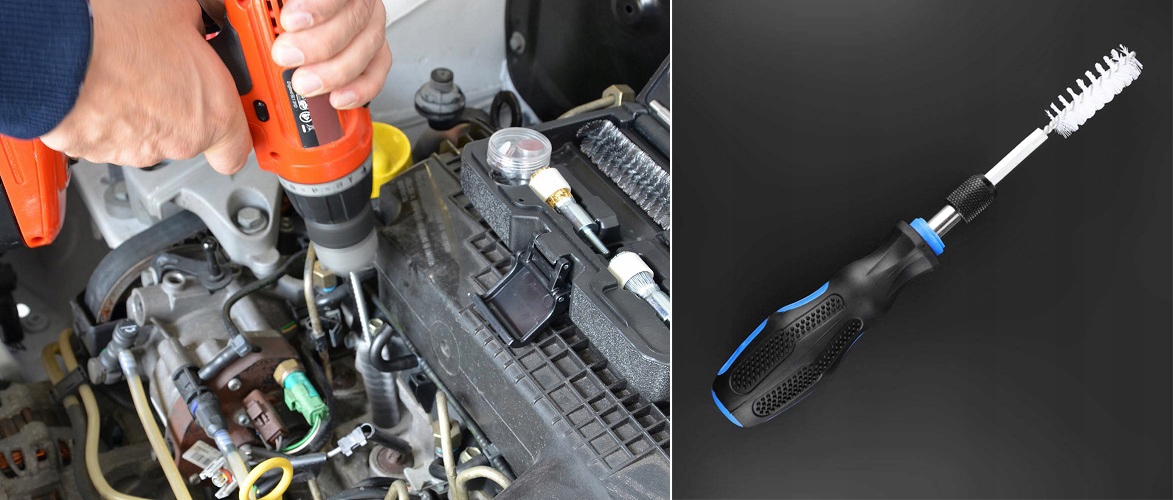 Набір щіток для патронів інжекторів, свічок запалювання та свічок розжарювання. У комплект входить подовжувач і ручка. 38 щіточок різної жорсткості. Щітки також підходять для використання в електричних і пневматичних дрилях. Усі щітки з приводом 1/4 дюйма. Для очищення та видалення задирок з циліндрів, гільз, труб, гнізд свічок запалювання, інжекторів тощо.
