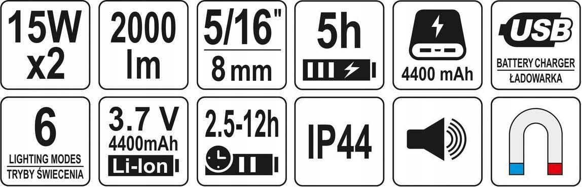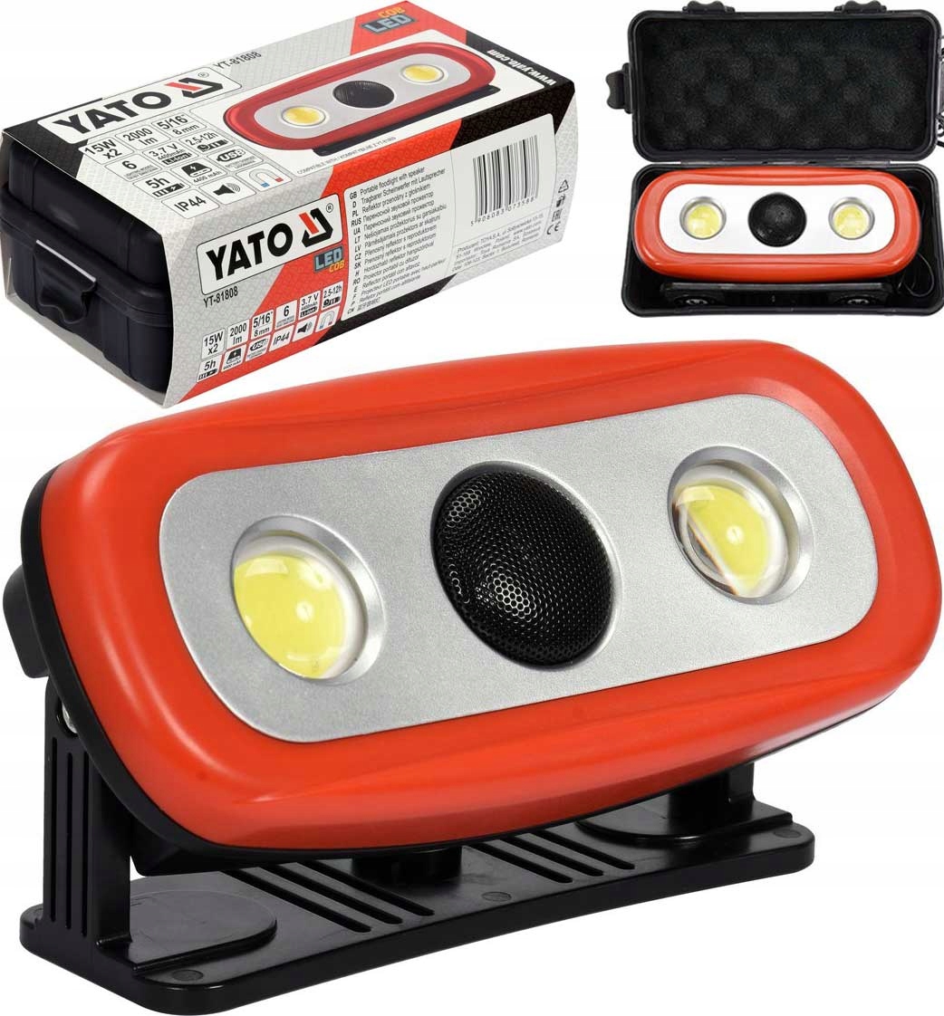 ПОРТАТИВНИЙ СВІТИЛЬНИК З ДИНАМІКОМ 2X15W, 2000LM, LI-ION 3.7V 4400MAH, IP44, POWERBANK