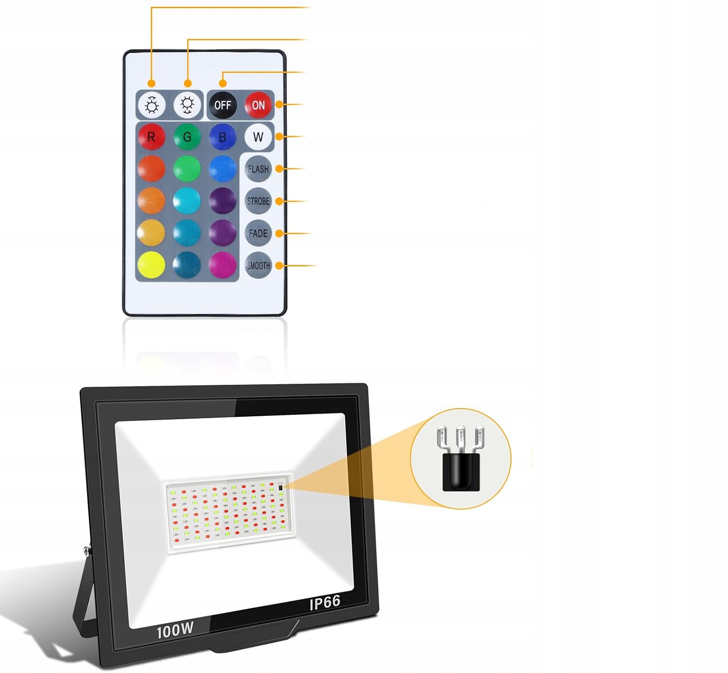 Багатокольоровий світлодіодний прожектор: світлодіодний прожектор RGB потужністю 100 Вт пропонує 16 різних кольорів на вибір, у тому числі тепле біле світло. Оснащений світлодіодами високої яскравості, він дозволяє персоналізувати кольори та запам’ятовувати налаштування завдяки функції пам’яті.