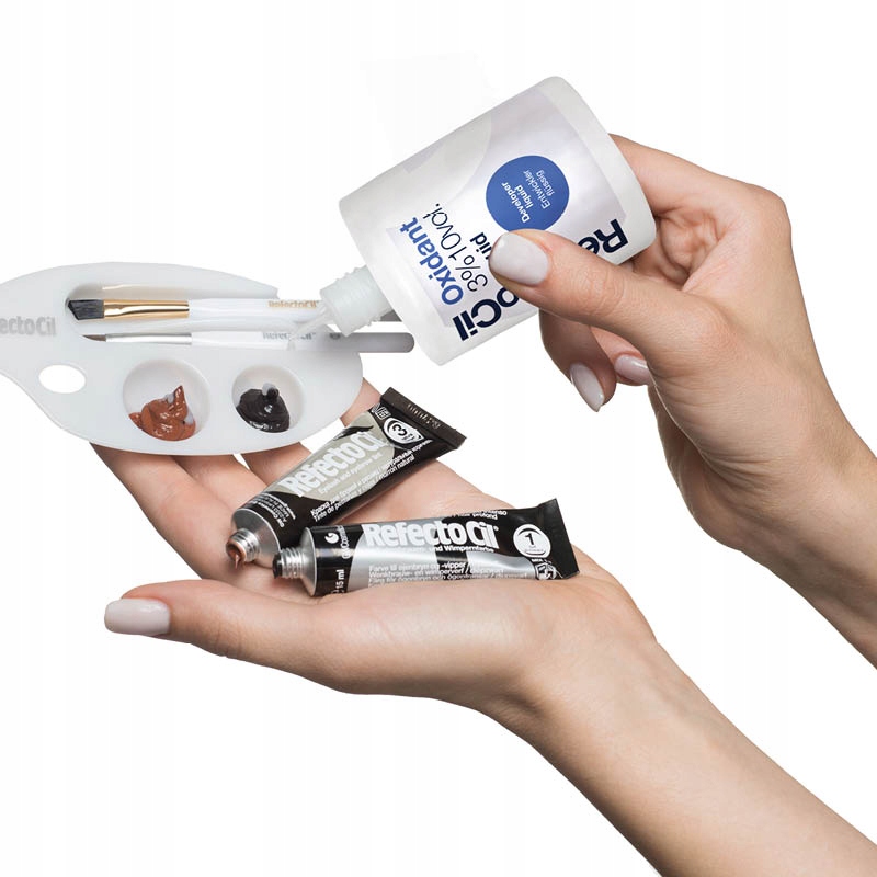 ☝️ Крок 2. Безпосередньо перед процедурою змішайте 2 см світло-коричневого з 10 краплями рідини RefectoCil Oxidant 3% (або 15- 20 крапель крему RefectoCil Oxidant 3%) до отримання однорідної консистенції.