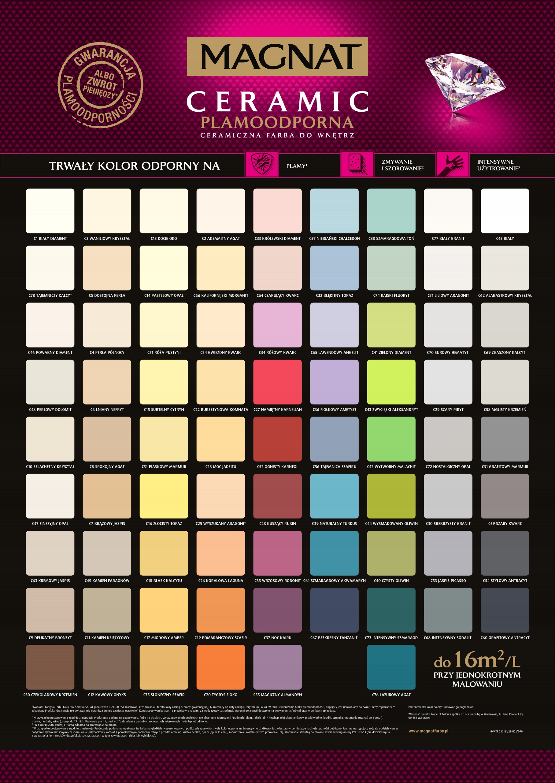 Magnat CERAMIC — фарба третього покоління, виготовлена за інноваційною технологією CERAMIC SYSTEM, яка базується на керамічних компонентах і найякісніших смолах і пігментах. Ця унікальна формула забезпечує фарбі MAGNAT CERAMIC вищі за середні показники стійкості до стирання та багаторазового миття, а також означає, що лакофарбове покриття не вбирає бруд і специфічні плями.
