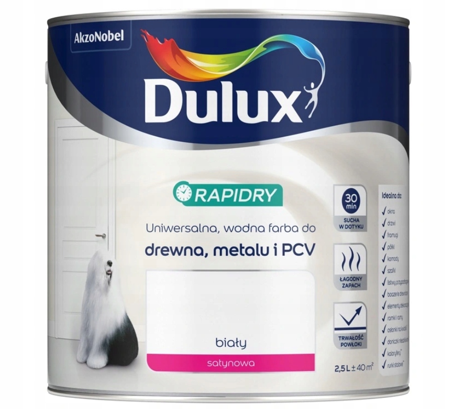 Dulux Rapidry - це найякісніша універсальна швидковисихаюча акрилова емаль на водній основі для дерева, металу та ПВХ. Має м’який запах, а сучасна формула швидко створює довговічне, не жовтіє покриття, стійке до механічних факторів і температури.