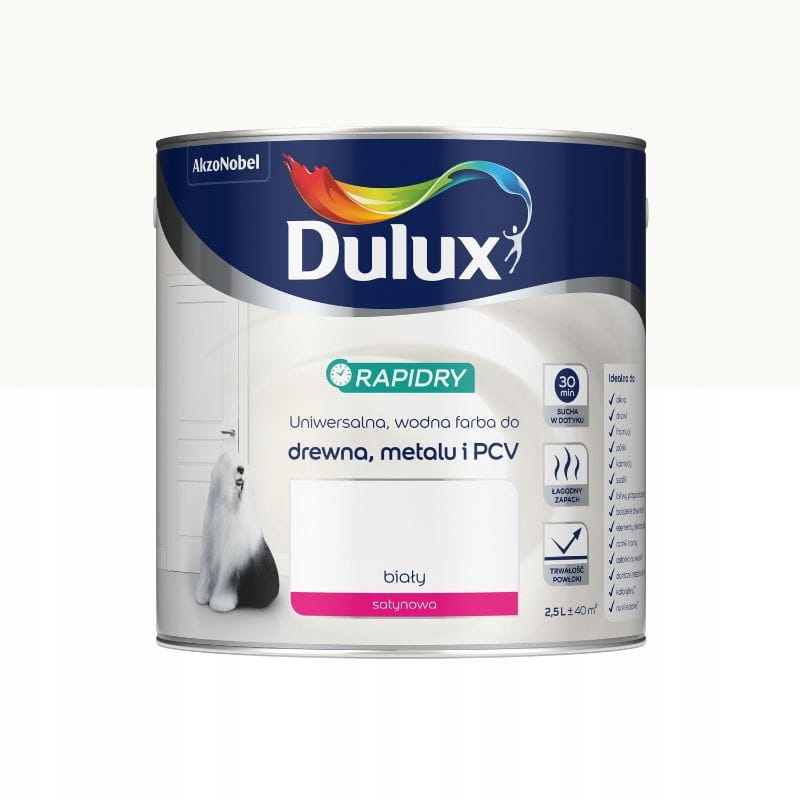 Dulux Rapidry — високоякісна фарба на водній основі, яка швидко висихає, для деревини, металу та ПВХ. Покриття висихає за 30 хвилин.