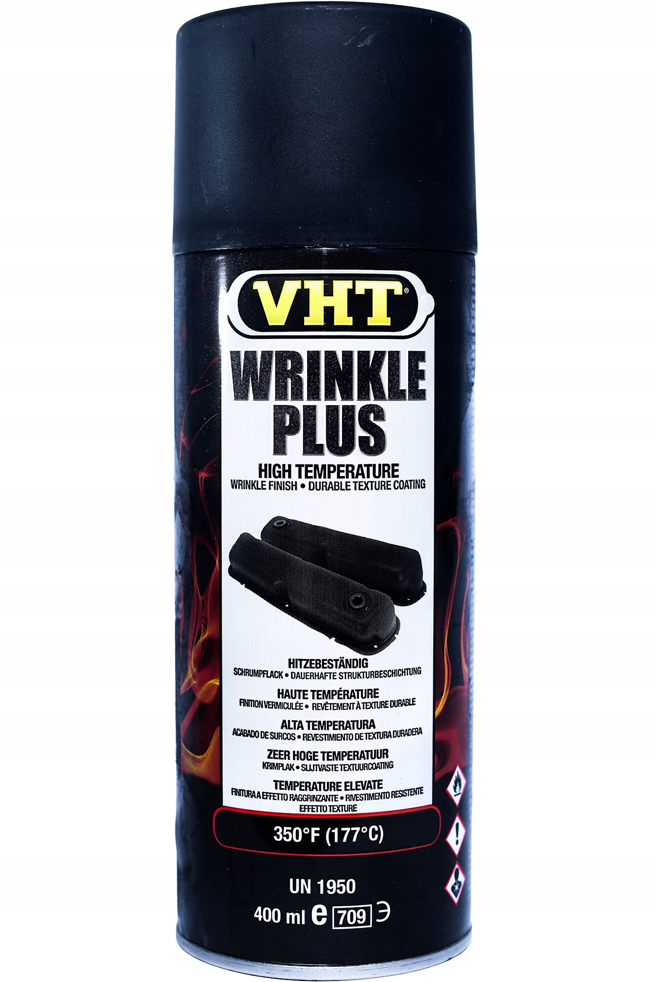 VHT Wrinkle Plus™ поєднує інтенсивні кольори з цікавою та нестандартною текстурою для досягнення незвичайного вигляду. Він термостійкий до 350°F (177°C) і ідеально підходить для фарбування всіх металевих поверхонь. VHT Wrinkle Plus™ стійкий до вицвітання, жиру, розчинників і несприятливих погодних умов. У той же час покриття є надзвичайно міцним і стійким до іржі, корозії, відколів і тріщин.