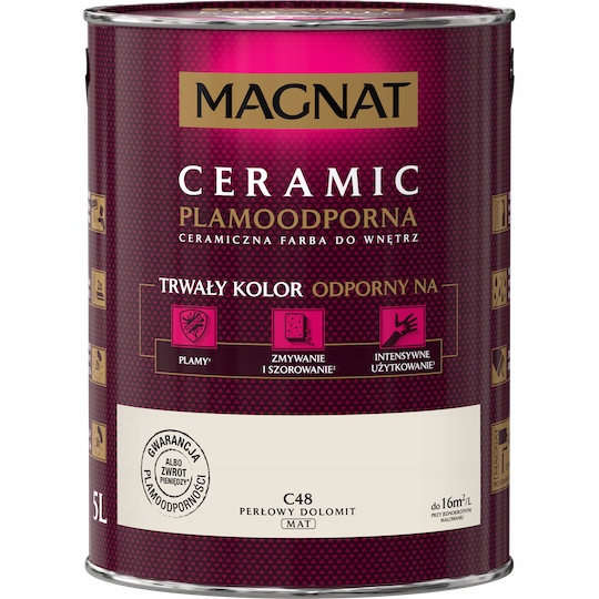 MAGNAT CERAMIC, керамічна фарба для інтер’єру на основі керамічних компонентів і найякісніших смол і пігментів. Ця унікальна формула забезпечує фарбі MAGNAT стійкий колір, стійкий до: плям, миття та чищення, а також інтенсивного використання. Лакофарбові покриття не вбирають бруд і «складні» плями¹ і стійкі до дезінфікуючих засобів².