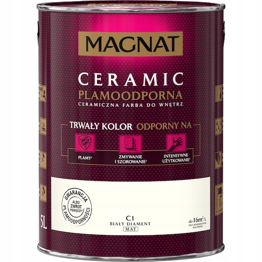 Magnat CERAMIC — фарба третього покоління, виготовлена за інноваційною технологією CERAMIC SYSTEM, яка базується на керамічних компонентах і найякісніших смолах і пігментах. Ця унікальна формула забезпечує фарбі MAGNAT CERAMIC вищі за середні показники стійкості до стирання та багаторазового миття, а також робить лакофарбові покриття не вбираючими забруднення та специфічні плями.