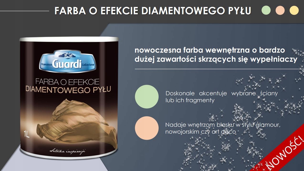 Фарба ідеально підходить для прикраси стін всередині кімнат, таких як вітальня, дитяча кімната, спальня, а також фініш у ресторанах, готелях та інших кімнатах, де ми хочемо отримати ексклюзивний ефект стін "алмазів".