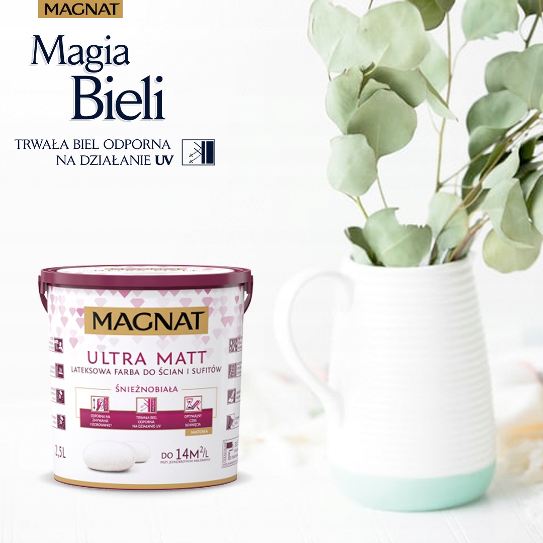 МАГНАТ Ультра матова - латексна, матова фарба, призначена для фарбування стін і стель. Виготовлена за інноваційною технологією на основі композиції відібраних компонентів, забезпечує матовість і стійкість до УФ.