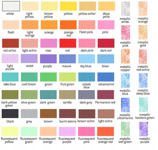 Містить 48 класичних кольорів і 12 кольорів металік, які ідеально підходять для заходів на відкритому повітрі, майстер-класів і подорожей.