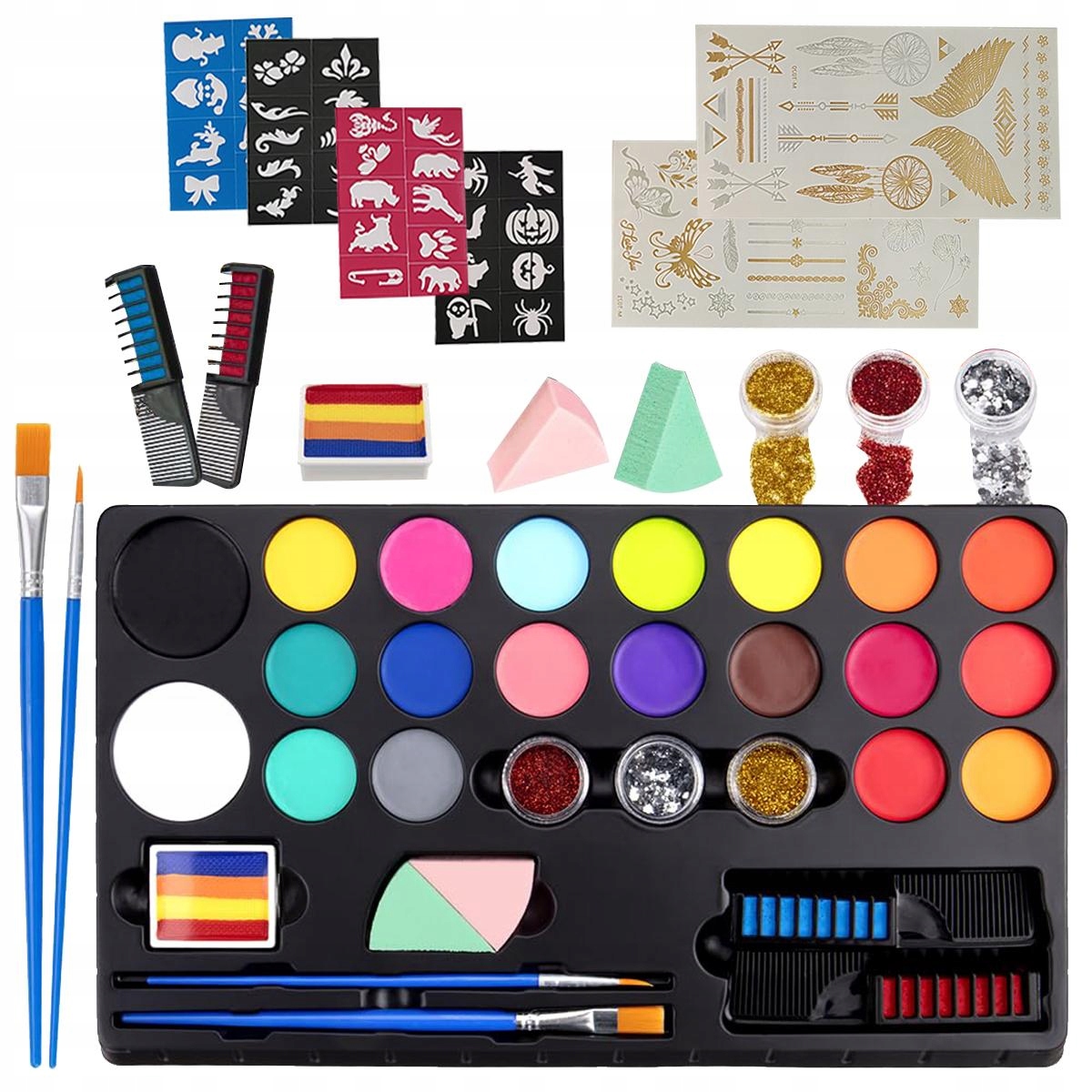 - Набір дитячих фарб для обличчя включає: 20 кольорів фарб, 3 флакони блискіток (рожевий, золотий і сріблястий), 1 веселкову фарбу для обличчя, 2 довгі пензлі, 2 гребінці для фарбування волосся, 2 бісквіти для торта, 4 набори по 36 шт. багаторазові трафарети (тварини, квіткові візерунки, мотиви Хеллоуїна та Різдва), набір із 2 наклейок для татуювань із фольги та 1 посібник користувача. Цей набір містить усе необхідне, щоб розфарбувати обличчя ваших дітей.👍