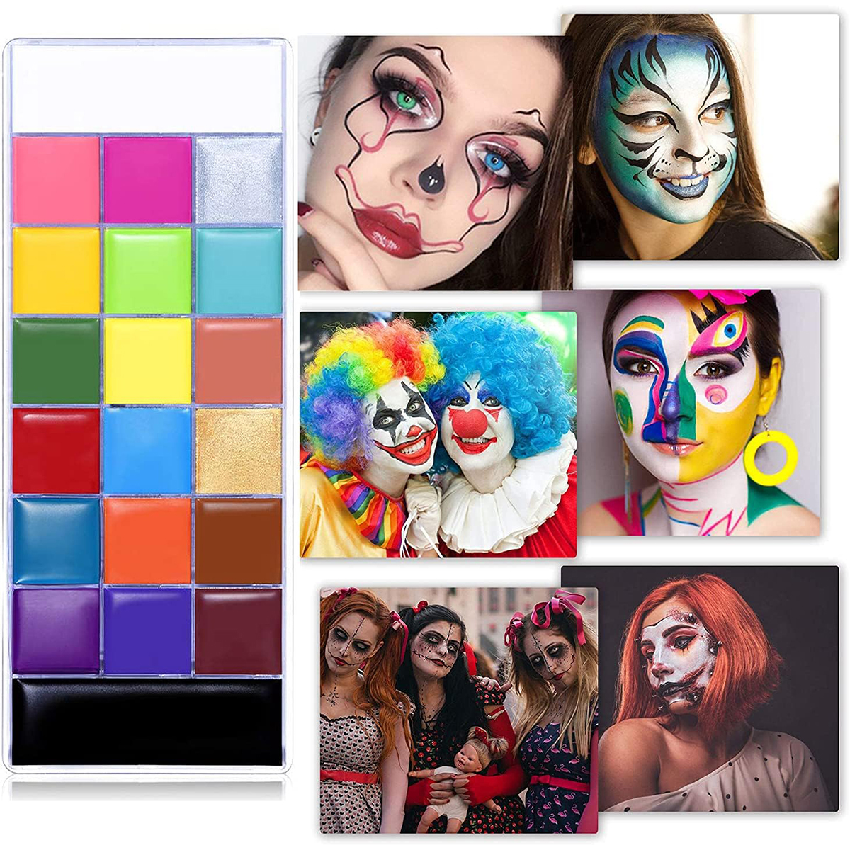 20 кольорів карнавального макіяжу, 10 пензлів, 5 трафаретів (з 30 різними візерунками), 1 палітра, підходить для всіх видів фестивалів, вечірок і заходів. 20 кольорів обличчя та тіла можна легко комбінувати, щоб створити різноманітні макіяжі для різних випадків.