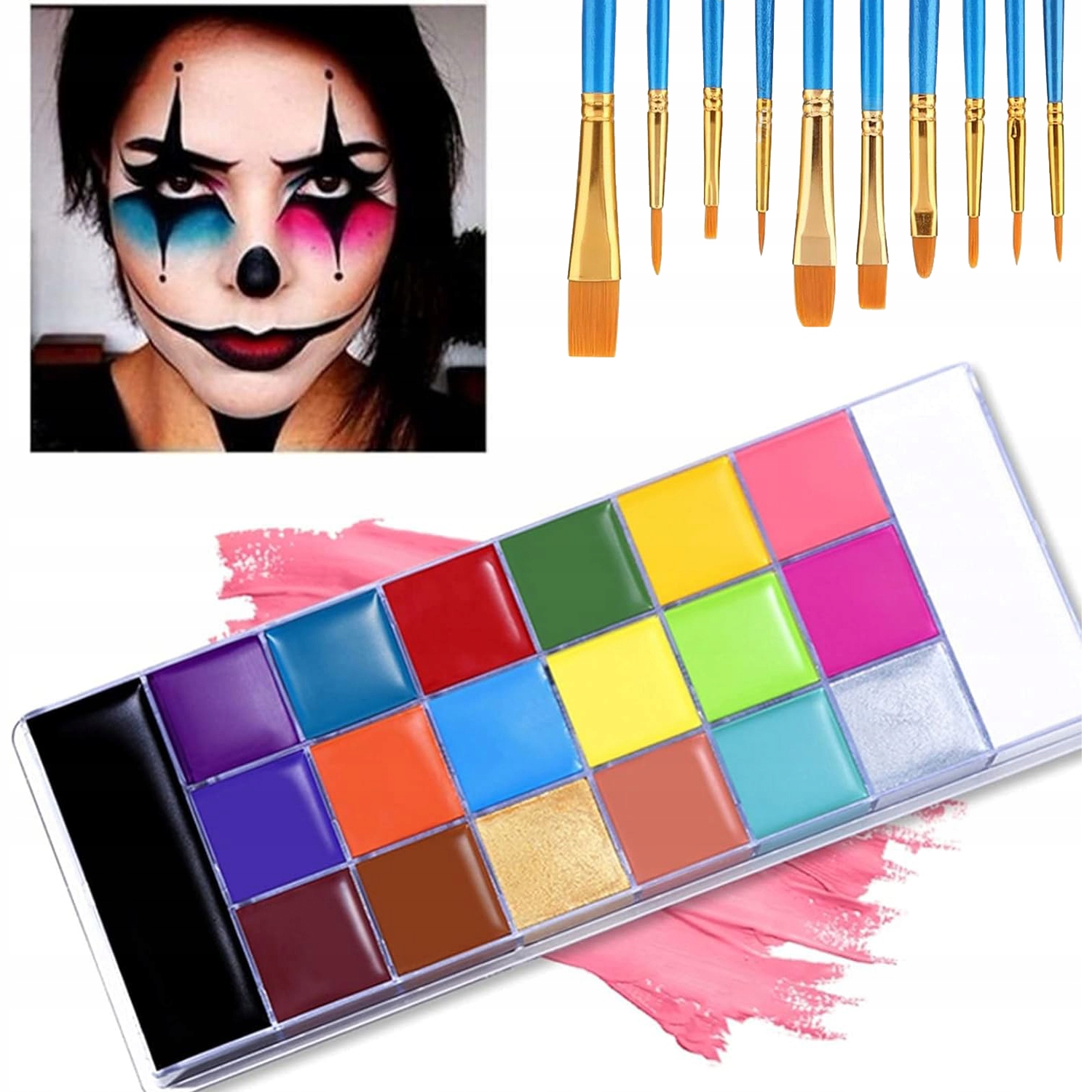 20 кольорів фарбування обличчя та тіла, кольори можна легко затінити, щоб створити різноманітні макіяжі, які задовольнять потреби різних випадків.