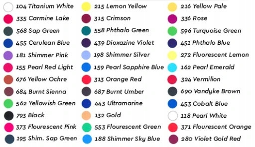 ✅ Кольори: Titanium White, Carmine Lake, Sap Green, Cerulean Blue, Shimmer Pink, Pearl Red Light, Yellow Ochre, Burnt Sienna, жовтувато-зелений, чорний, флуоресцентний рожевий, Shim. Соп-зелений, лимонно-жовтий, малиновий, фтало-зелений, троянда, бірюзово-зелений, жовто-блідий, діоксазиновий фіолетовий, мерехтливий сріблястий, фтало-блакитний, флуоресцентний лимонний, перлинно-сапфірово-блакитний, помаранчево-червоний, перлинно-смарагдовий, кіновар, спалена умбра, ультрамарин, Вандайк-коричневий , Кобальтовий блакитний, золотий, перлинно-білий, флуоресцентний помаранчевий, флуоресцентний зелений, мерехтливий небесно-блакитний, фіолетово-золотистий червоний