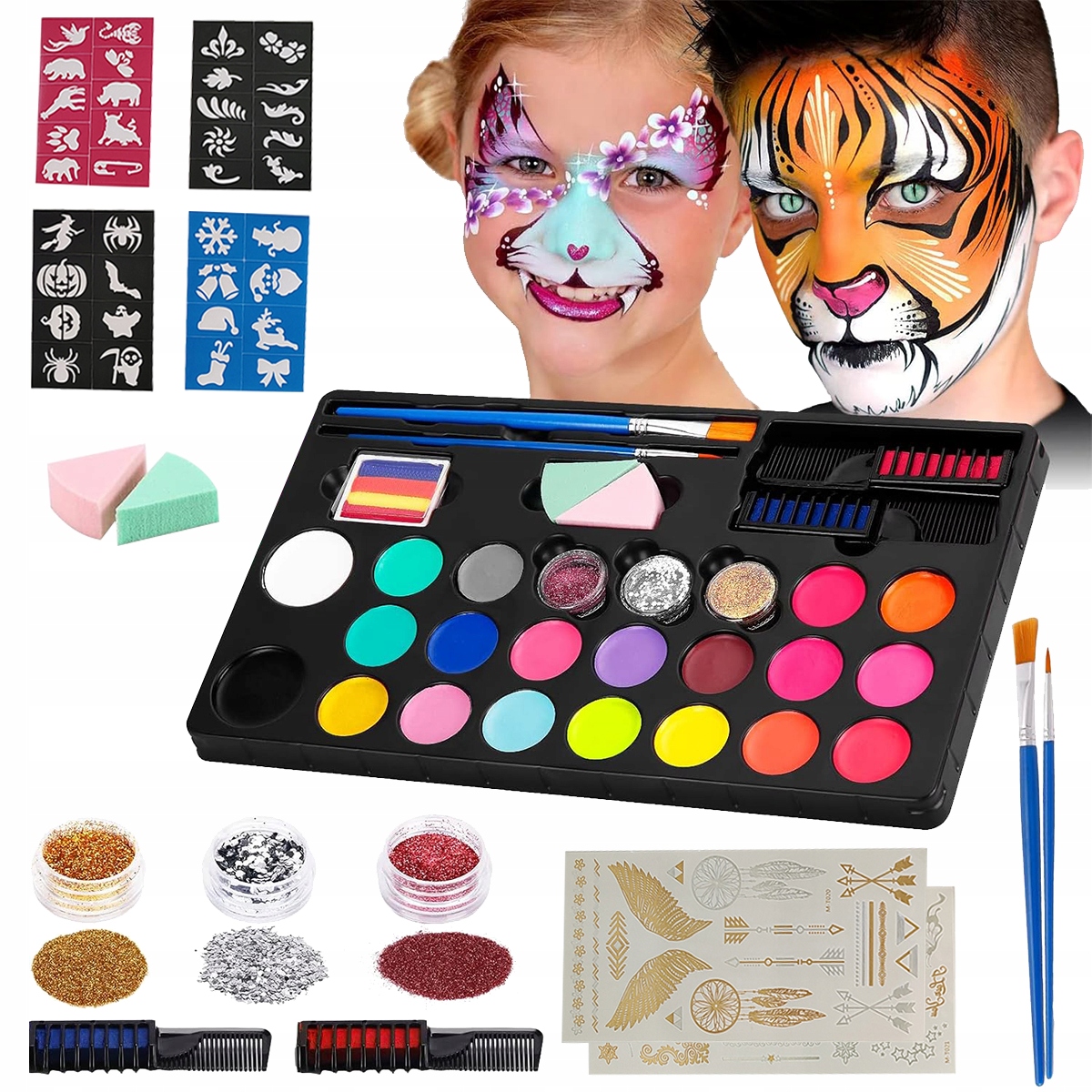 - Цей набір для макіяжу включає: 20 кольорів фарби для обличчя, 3 флакони з блискітками (рожевий, золотий і сріблястий), 1 веселкову фарбу для обличчя, 2 довгі пензлі, 2 гребінці для фарбування волосся, 2 губки для торта, 4 набори з 36 багаторазових шаблонів (тварини, квіткові візерунки, елементи Хеллоуїна та Різдва), 2 набори фольгованих наклейок для татуювань та 1 посібник користувача. Цей набір містить усе необхідне, щоб розмалювати обличчя ваших дітей.