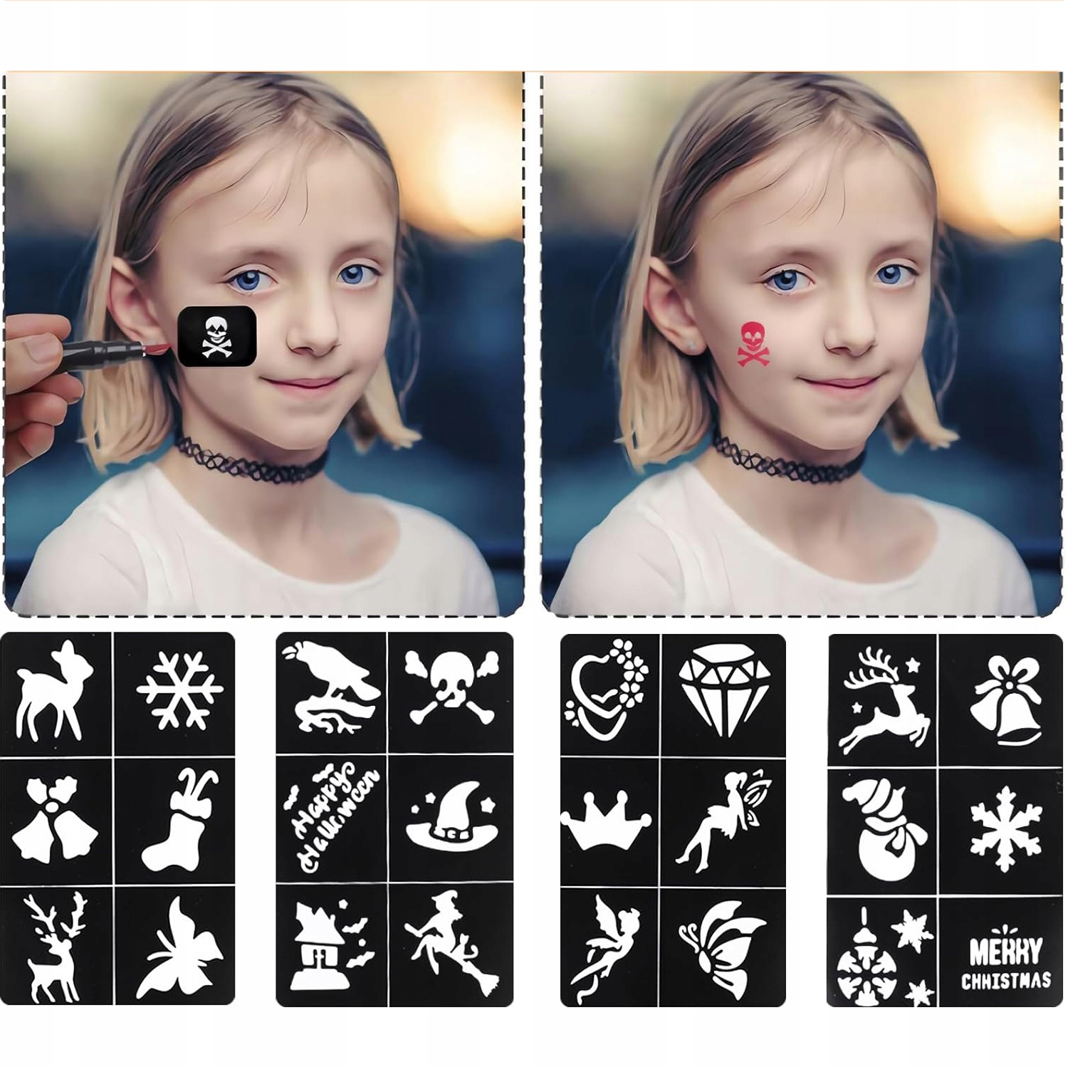 - 20 карнавальних кольорів макіяжу , 10 пензликів, 5 трафаретів, 30 різних візерунків, підходить для всіх видів фестивалів, вечірок, заходів.