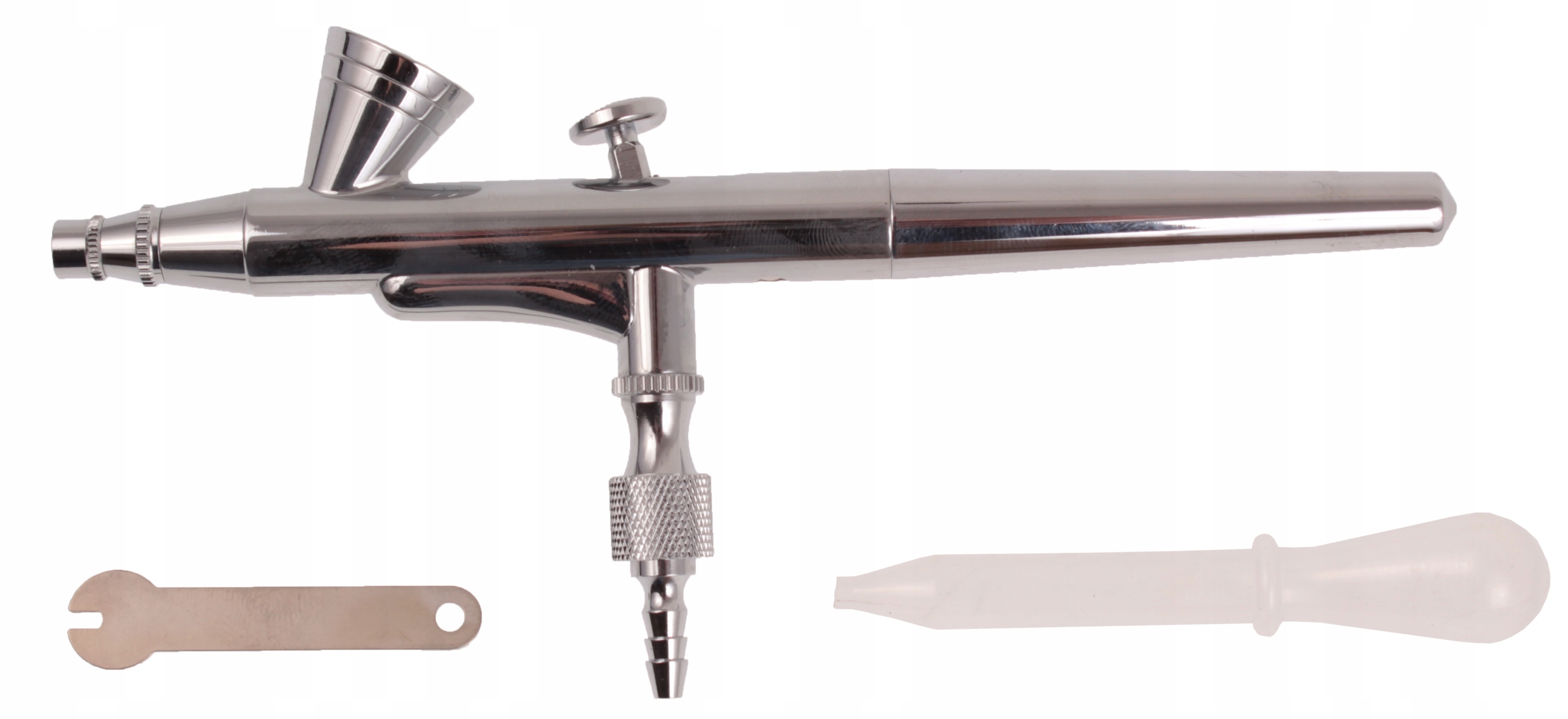 Високоякісний фарбувальний пістолет для художнього розпису або тонких ретушів. У комплект входить розбірний ключ, піпетка для заправки бака для лаку та перехідник від різьблення до патрубка напірної труби.