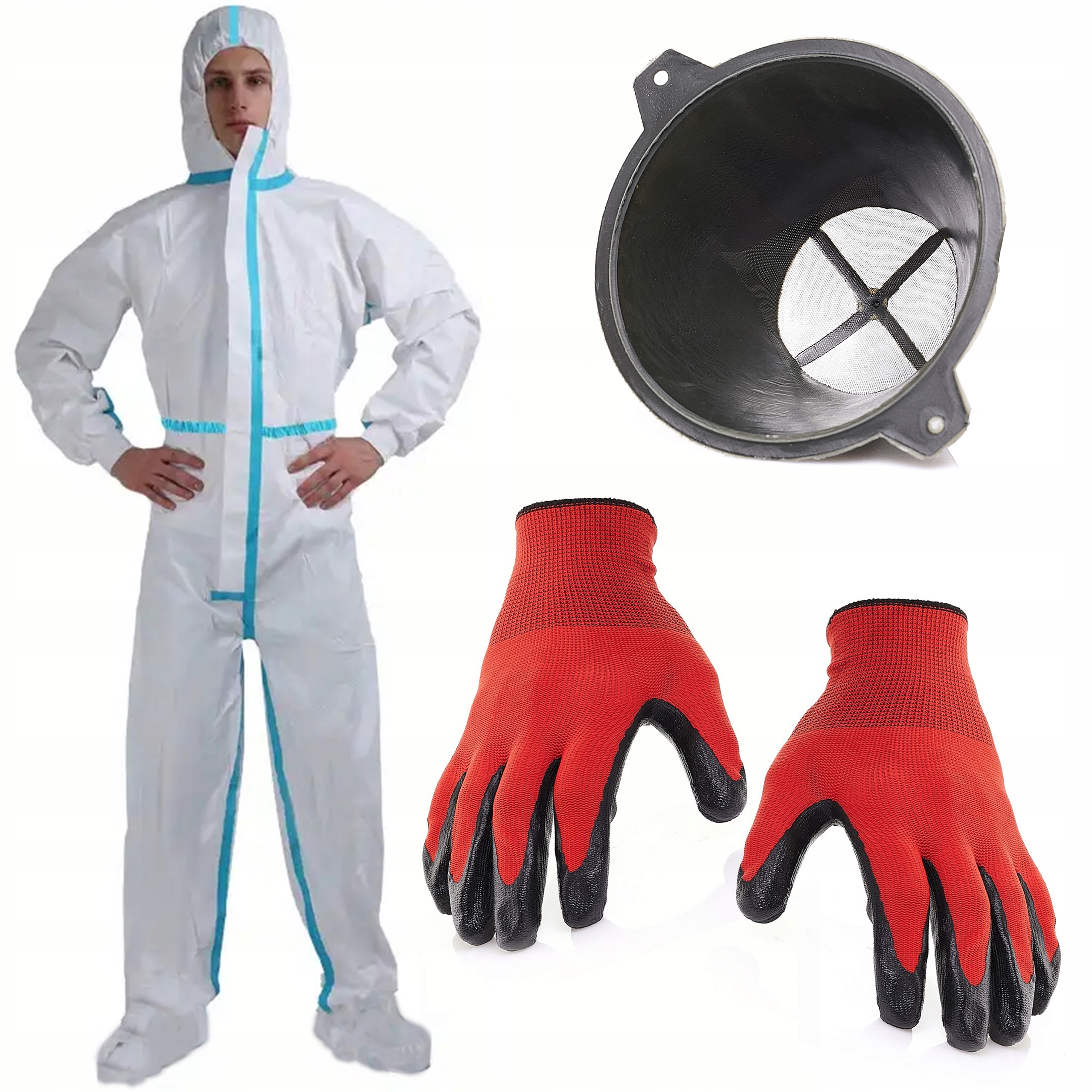 міцний малюнок костюма, що забезпечує повний захист одягу та тіла проти бруду . Комбінезон виготовлений зі світлого, дихаючого матеріалу, який гарантує комфорт під час довготермінової роботи. Набір включає ергономічні захисні рукавички з покриттям, що не є слизом , захищаючи руки від фарби та розчинників.