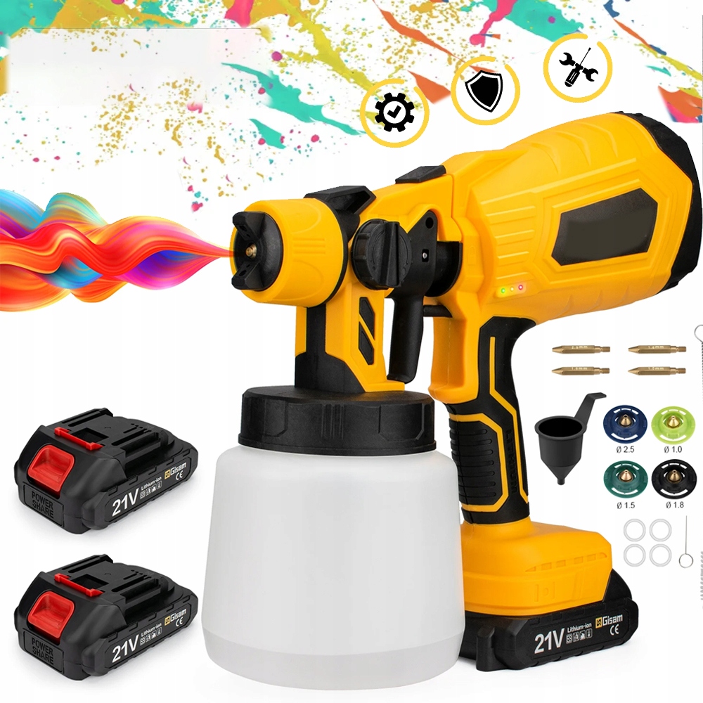 Поральтовані пістолети для внутрішніх фарб оснащені нещодавно вдосконаленою латунною насадкою, яка запобігає пошкодженню, спричиненому падінням або видавленням, не засмічується легко і легко чистити. Контейнер 1000 мл забезпечує достатню кількість фарби для більш тривалого обприскування, не часто поповнюючи. Оснащений 2 акумуляторами, які повністю завантажені всього за 2-3 години, що значно підвищує ефективність роботи.