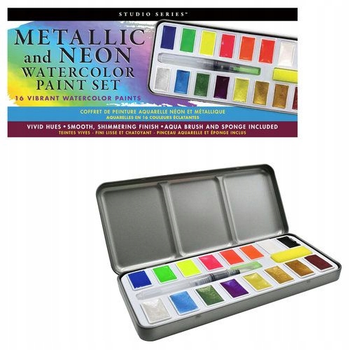 Набір з 16 акварельних фарб у закритому металевому коробці від Peter Paper Press. У коробці ви знайдете 8 неонових кольорів та 8 блискучих металевих відтінків. Ідеальний набір для початківців та досвідчених художників. Обкладинка має великий простір для змішування кольорів та створення власних кольорів.