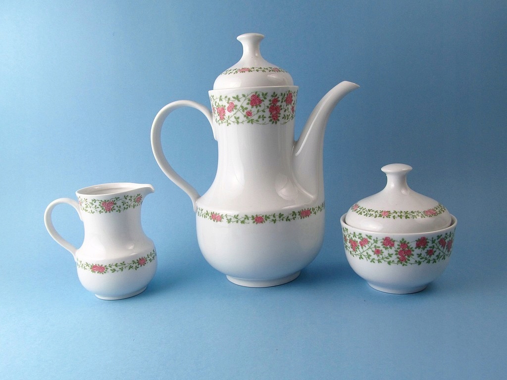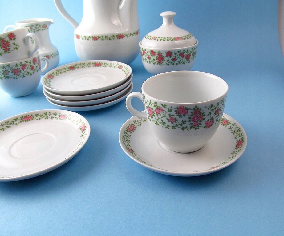 Здрастуйте, пані та панове....... предметом продажу є порцеляновий сервіз, виготовлений у Німеччині приблизно в 1960/70 роках..... знаменита фабрика Kahl..... сервіз складається з глечика , цукорниця, молочник, шість чашок і 6 блюдець...... все чудово зроблено і в дуже гарному стані, лише на двох блюдцях є мінімальні дефекти, а одна чашка тріснута...... підсумовуючи : в набір входить повний комплект: глечик, цукорниця, молочник і чотири чашки з блюдцями, .... дві чашки з блюдцями не повна вартість.......... глечик 25 см. висота і діаметр 13 см, молочниця висота 11 см і діаметр 8 см., цукорниця висота 11,5 см і діаметр 10,5 см, чашки висота 7 см і діаметр 8 см, блюдця 13,5 см. см в діаметрі........ прекрасний комплект і прикраса будь-якого стильного інтер'єру!ДУЖЕ РЕКОМЕНДУЮ!!!!