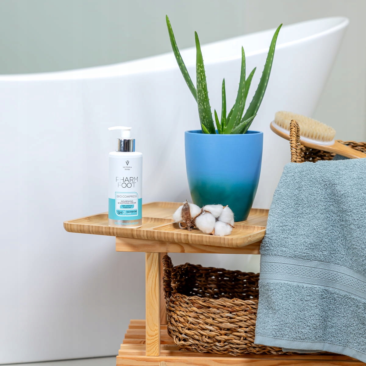 "Одяг" у кремі - БІО КОМПРЕС, тобто живильний і заспокійливий крем, до складу якого входятьмолозиво та алое. Молозиво як чудове джерело концентрованих вітамінів і поживних речовин підтримує регенераційні процеси епідермісу. Бавовняна олія, що міститься в кремі, має протизапальні властивості, а також підтримує стійкість шкіри до інфекцій. Він також стимулює процес відновлення тканин, регенеруючи суху шкіру ніг і відновлюючи її еластичність. Пантенол, що міститься в кремі, допомагає заспокоїти запалення та подразнення, а також сприяє регенерації шкіри. Алое має зволожуючі властивості та ефективно діє на суху шкіру ніг завдяки вмісту численних речовин, які позитивно впливають на шкіру, таких як мінерали, вітаміни та амінокислоти.