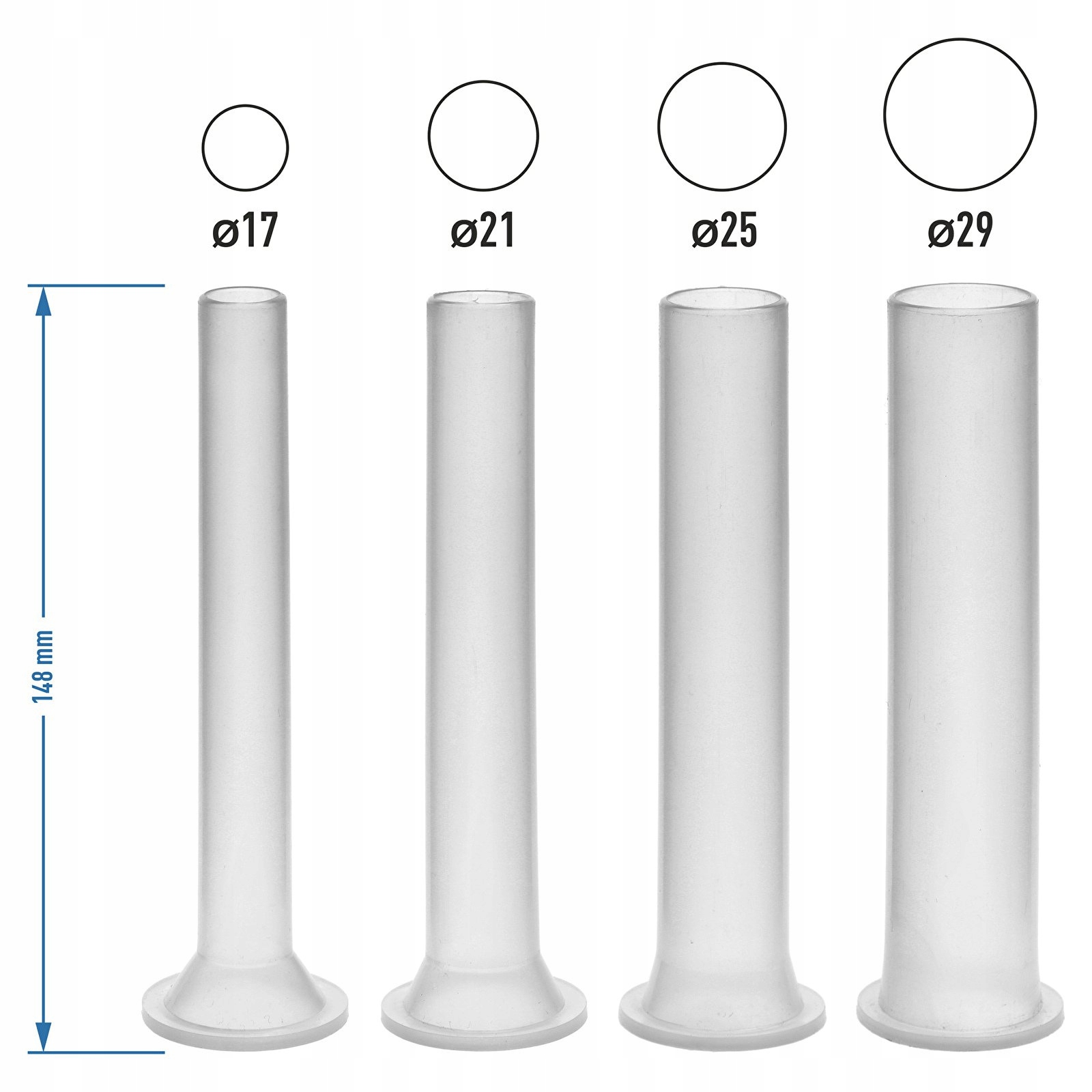 В набір входять чотири пластикові воронки з вентиляційною системою різних розмірів - діаметри: 17, 21, 25 і 29 мм.