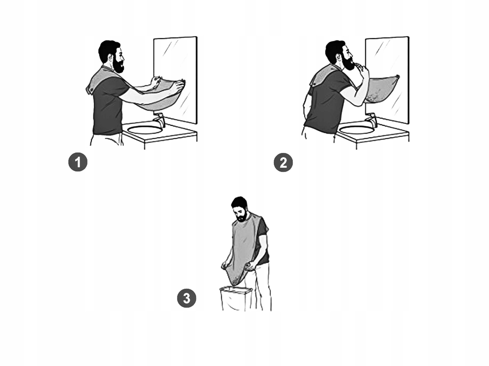 Накидка дуже зручна у використанні. Просто прикріпіть його до дзеркала за допомогою двох присосок. Після завершення дій з догляду від’єднайте присоски та зберіть матеріал рукою таким чином, щоб зрізана щетина залишилася всередині, а потім просто викиньте вміст у відро для сміття. Таким чином ми уникнемо непотрібного безладу в раковині та ванній.