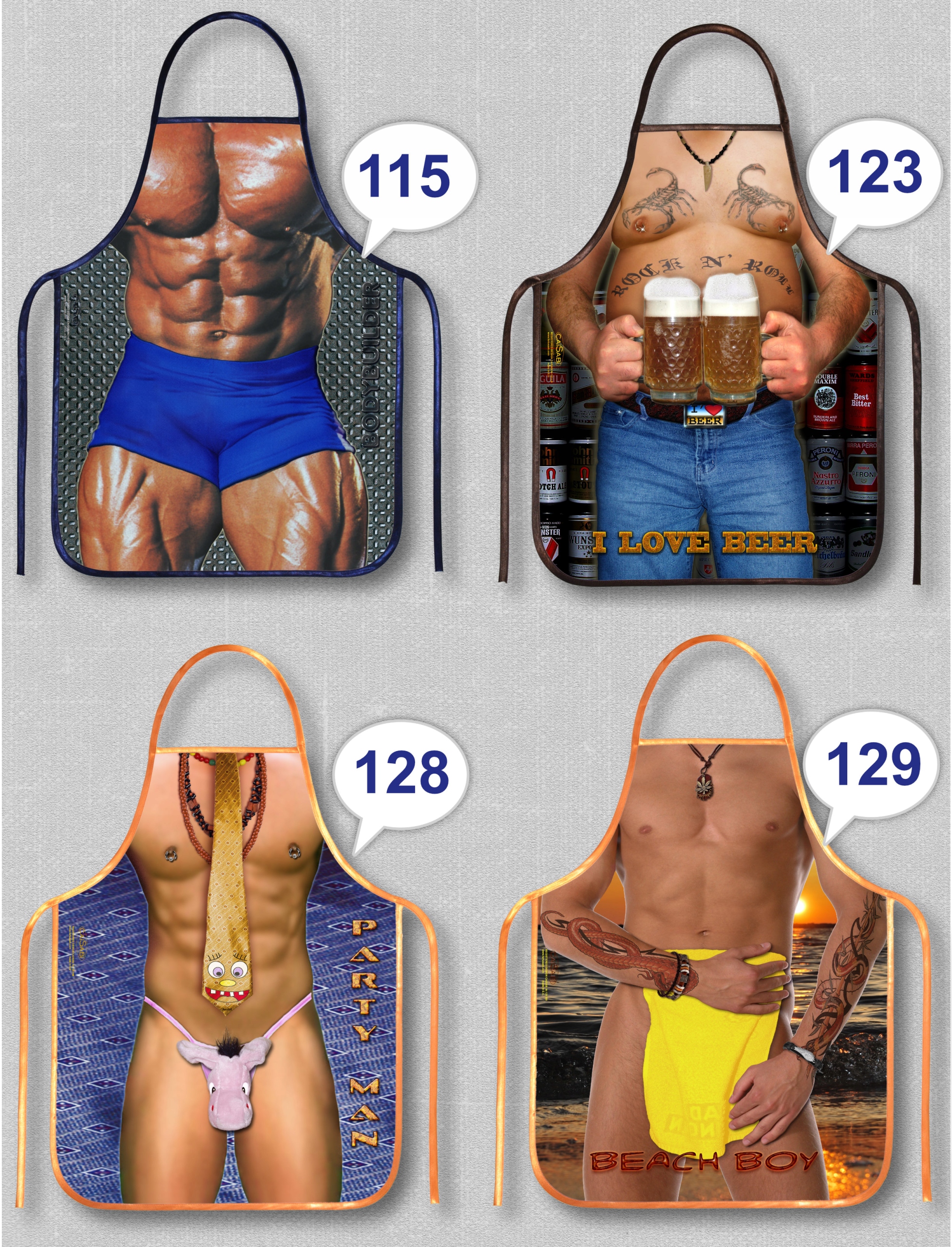 - Ми також пропонуємо подвійні фартухи з надрукованим на кожній стороні мотивом та аксесуари наприклад, практичний таймер із будильником або металеве мило для рук, яке усуває неприємні запахи, наприклад, часнику, риби тощо.