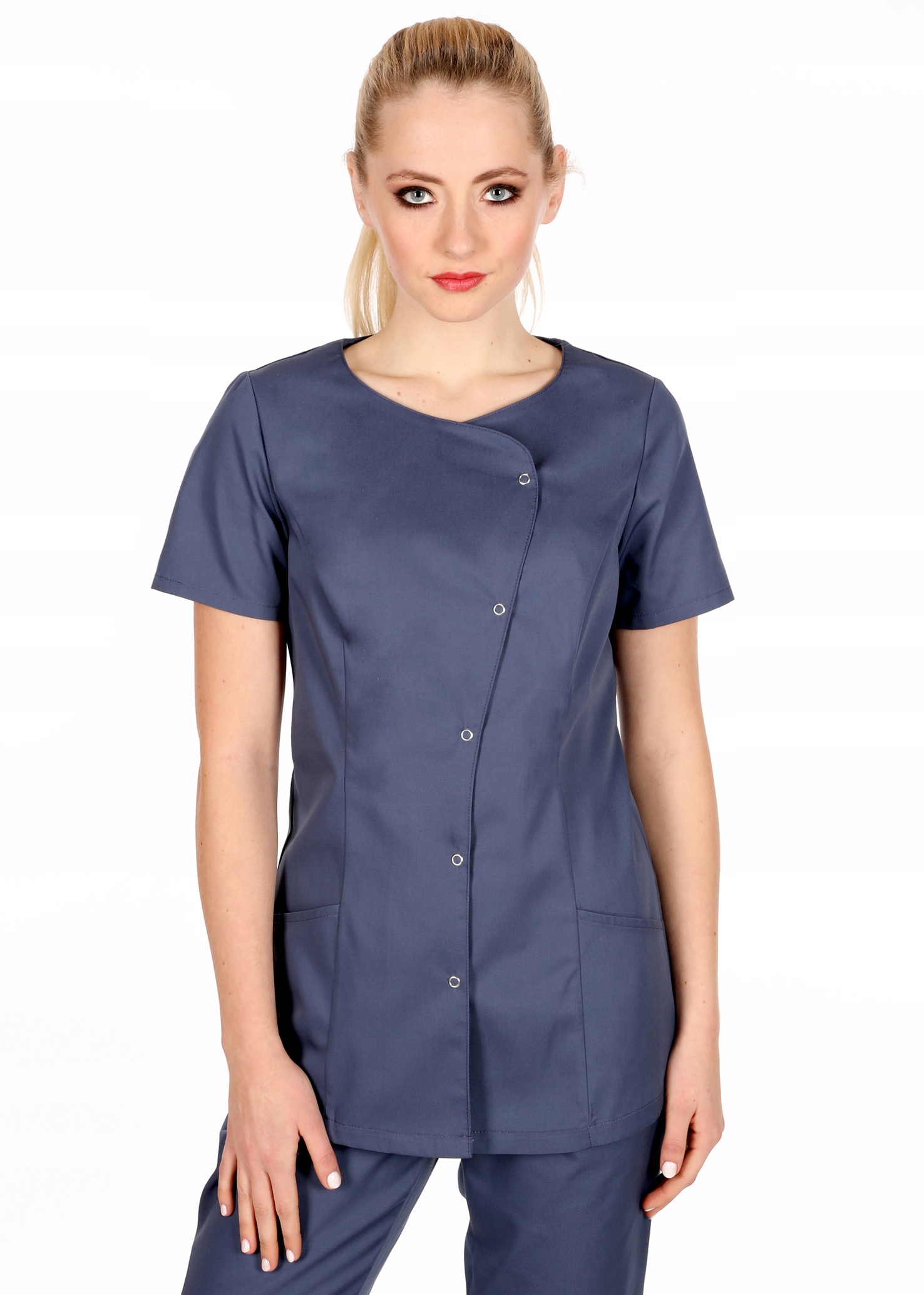 Куртка медична, медична та косметична на застібках, Schaeffer. Застібка передбачає два варіанти вирізу, французькі вирізи спереду формують силует. Можна поєднувати з брюками-сигаретами або класичними прямими брюками. Короткі рукави, дві кишені на висоті стегна (ми рекомендуємо розмістити тут логотип компанії або зображення зграї - для цього зв'яжіться з виробником).