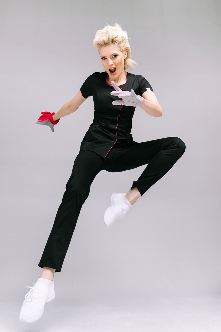 Фартух Клавдія це класичний і елегантний наряд з цікавим кроєм. Ніжне декольте, який забезпечує комфорт і делікатно підкреслює та подовжує шию. Приталений крій ідеально підкреслює жіночу фігуру, додаючи елегантності та класу. Уніформа закінчена має декоративне оздоблення, що додає сучасного стилю, і все це дуже міцно застібається зручні та практичні кнопки. Що важливо, модель має практичні кишені необхідні в повсякденній роботі.