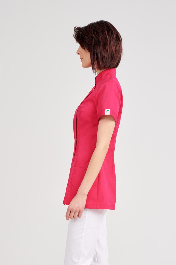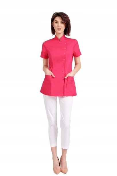 Про товар: Фартух з міцного матеріалу, застібається для знімків. Приталений, приталений крій підкреслює фігуру. Фартух з шортами рукава і комір-стійка. Дві великі кишені, розташовані на передній частині блузки. Класика в сучасне видання.