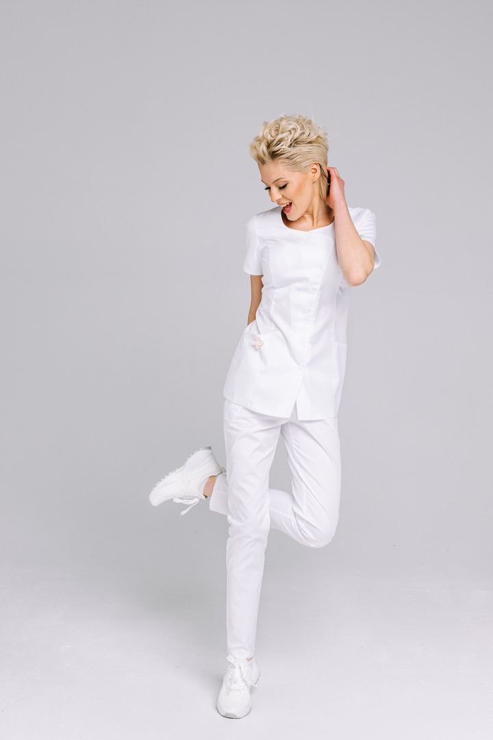 Фартух з міцного матеріалу матеріал кріпиться кнопками. Приталений, приталений крій підкреслює фігуру. Фартух з короткими рукавами та вирізом U. Дві великі кишені розташований на передній частині блузки. Класика в сучасному стилі.